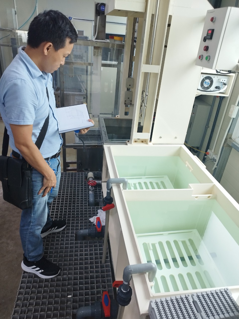Hình ảnh kỹ thuật viên M&D khảo sát để lắp đặt tấm rung vào bể nhựa có sẵn